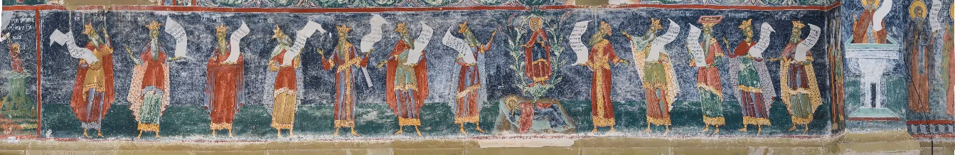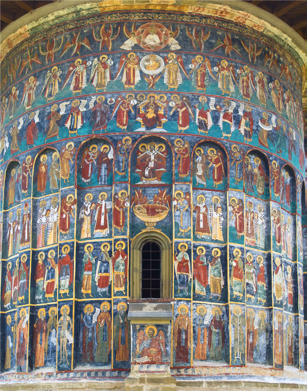 Pe cele trei abside exterioare se desfășoară, pe șapte registre, cea mai amplă compoziție în frescă: Rugăciunea Tuturor Sfinților. Este o procesiune a îngerilor, prorocilor, apostolilor, arhiereilor, martirilor și monahilor care se îndreaptă în rugăciune spre axul altarului, unde este pictat Domnul nostru Iisus Hristos. Astfel, fiecărui registru de sfinți îi corespunde semnificația teologică a câte unui ipostas hristic: heruvimilor și serafimilor – Hristos Cel Vechi de Zile, cetelor îngerești - Hristos Emanuel, cetei prorocilor - icoana Întrupării (Fecioara Maria cu pruncul Iisus), apostolilor – Hristos Arhiereu, arhiereilor - Hristos în potir, ipostasul euharistic fiind încadrat aici de Deisis (Fecioara Maria și Sfântul Ioan Botezătorul, înfățișând rugăciunea Bisericii, nunta Mielului cu Biserica și cu sufletul creștin). După registrul martirilor, ultima procesiune este cea a monahilor, a asceților (cuvioși și cuvioase), iar central, pe micul contrafort, este reprezentat Sfântul Ioan Botezătorul, înaripat și cu capul în mâini. El este un model al monahismului, pentru că viețuirea sa a fost prin excelență una monahală. Pe filacterul său este îndemnul la pocăință: „Pocăiți-vă ca s-a apropiat Împărăția Cerurilorˮ. Această scenă este limitată în partea de jos de un hotar asemănător coloanei infinitului, ce simbolizează atemporalitatea, veșnicia.