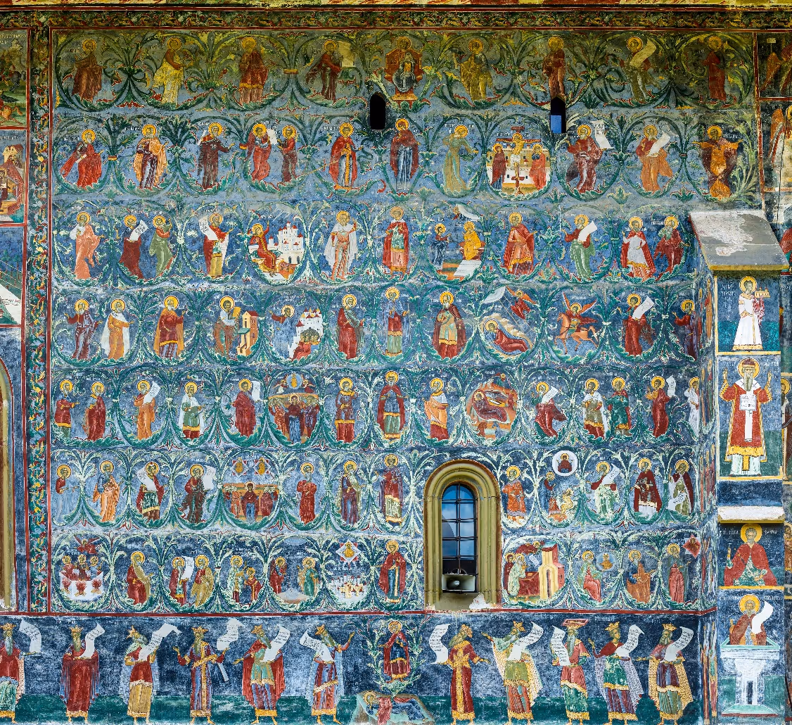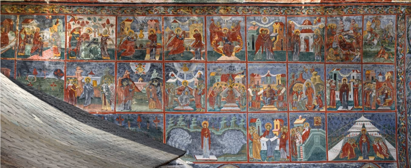 Iconografia exterioară a Suceviței nu mai păstrează temele eroice, precum alte ansambluri monahale dinaintea ei, acestea fiind înlocuite cu scene de meditație teologică.