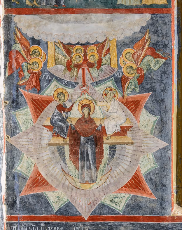 Această imagine se regăsește în arta athonită, în cea italiană, dar și pe icoanele rusești. Temeiul biblic poate fi cel din Apocalipsă, unde apare „o femeie (Fecioara) înveșmântată cu soarele, și luna era sub picioarele ei, iar pe cap purta cununa din douăsprezece steleˮ (Apocalipsa 12, 1). Este pictată pe peretele sudic, în contextul celorlalte compoziții iconice ale unor rugăciuni către Fecioara Maria. Maica lui Dumnezeu are semiluna sub picioarele ei (acesta fiind un simbol mariologic încă din Bizanț), iar Persoanele Sfintei Treimi o încununează.