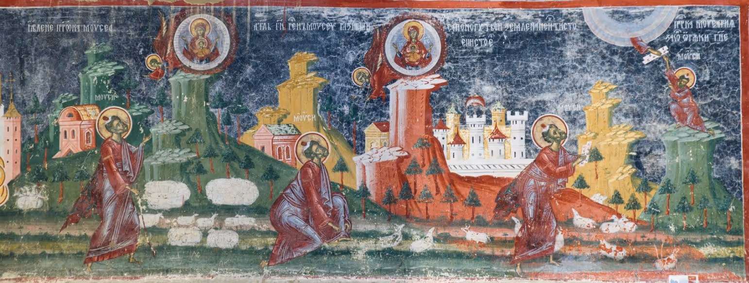 În partea cea mai de jos, pe peretele sudic al edificiului, într-o friză, este ilustrat momentul uciderii călugărilor din Sinai și Rait (fapt petrecut în secolul al VII-lea), apoi în continuare, în mișcare dinamică, este pictat Moise care paște oile în Muntele Sinai și i se descoperă sub formă de viziune rugul aprins, ce ardea și nu se mistuia, moment în care Moise de descalță de sandale, pentru că îngerul Domnului îi spune că pământul pe care calcă este sfânt. Acum este momentul în care Moise primește poruncă de la Dumnezeu să elibereze poporul evreu din robia egipteană. În continuarea acestui moment este ilustrată secvența în care Moise primește tablele legii (cele 10 porunci) pe muntele Horeb.