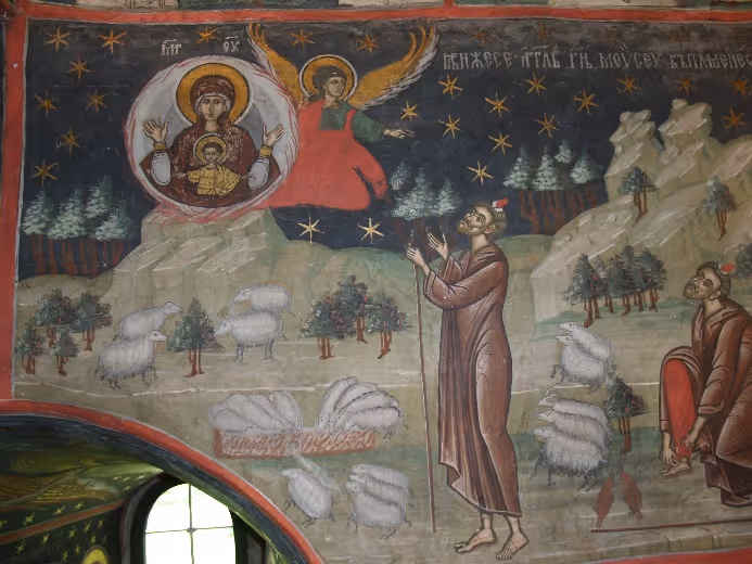 Viziunea Rugului Aprins mai este reprezentată în camera mormintelor și în altarul bisericii. Aceste secvențe simbolizează felul în care Moise a primit o teofanie, o arătare în slavă a Înțelepciunii divine sub forma unei întrupări anticipate. Icoana rugului aprins simbolizează întruparea Mântuitorului Hristos din Fecioara Maria. Rugul este deopotrivă o icoană a filiației și a maternității dumnezeiești.